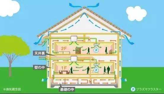 在日本的現(xiàn)代獨立住宅設(shè)計建造中,下部基礎(chǔ),一般為整體結(jié)構(gòu)的全現(xiàn)澆鋼筋混凝土“地下架空層基礎(chǔ)”,上部結(jié)構(gòu),一般為木結(jié)構(gòu)承重框架結(jié)構(gòu)類型。從圖中可以看出,本案圖例中,住宅內(nèi)部空氣的流動,有2大類型:1是住宅3大部位上空氣的流動——基礎(chǔ)、外墻、屋面,2是住宅內(nèi)部,2個樓層上,個各功能房間內(nèi)部,通過安裝“全熱交換型通風(fēng)換氣系統(tǒng)”,進(jìn)行的空氣的流動。全熱交換型通風(fēng)換氣系統(tǒng)”,在夏季和冬季,2種情況下的2種不同的作用。